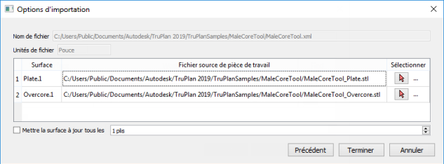 Lorsque vous importez des fichiers XML, vous pouvez créer des décalages qui sont stockés avec le projet. Vous pouvez également choisir d'ignorer le calcul de l'épaisseur de manière à pouvoir travailler rapidement dans TruPlan, par exemple pour réaliser des études de faisabilité au niveau de la forme générale d'une pièce. Si vous ignorez le calcul de décalage lors de l'importation, vous pouvez quand même l'effectuer ultérieurement à d'autres emplacements dans TruPlan.