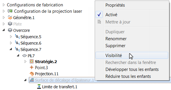 Pour optimiser les performances, les surfaces de décalage stockées sont masquées par défaut lors de leur création. Elles sont représentées par des noeuds dans le navigateur de TruPlan. Cliquez dessus avec le bouton droit de la souris et choisissez Visibilité afin de les visualiser à tout moment.