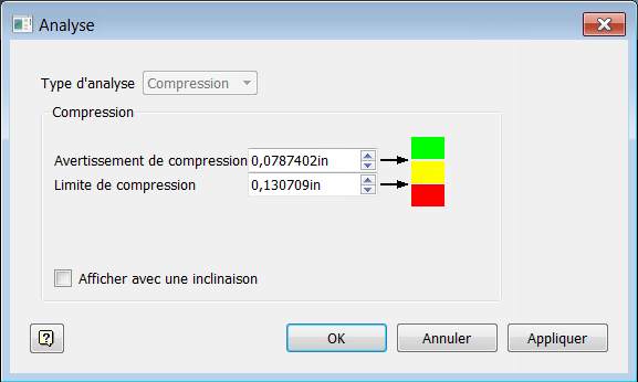 Si vous sélectionnez cette option, les inclinaisons sont utilisées en fonction de la valeur de compression à cet emplacement. Par exemple, si la valeur est supérieure à celle définie pour l'avertissement de compression et inférieure à celle définie pour la limite de compression, elle sera affichée en tant qu'inclinaison lorsque la valeur réelle dépend de ces limites et de leurs couleurs.