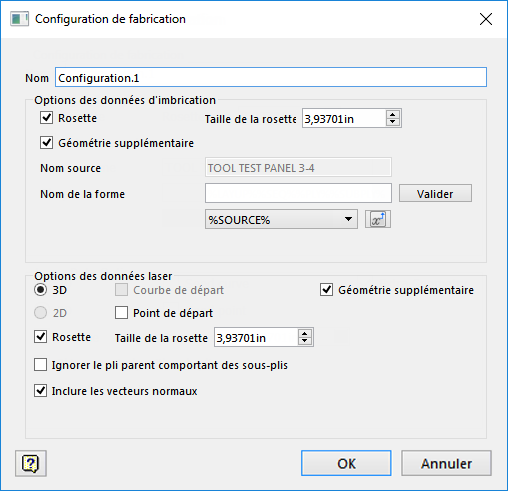 - Effectuez vos modifications dans les zones Options des données d'imbrication et Options des données laser de la boîte de dialogue Configuration de fabrication.