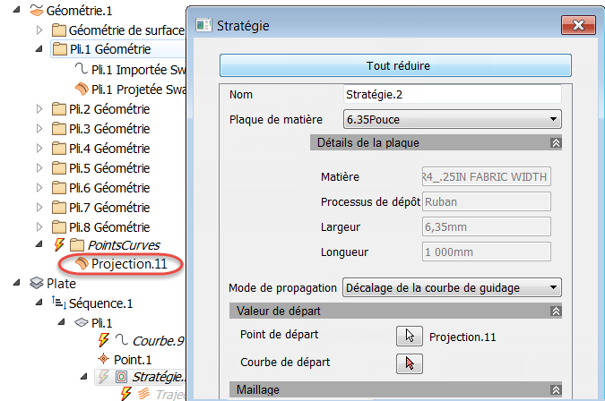 Chaque pli d'une couche doit disposer d'une stratégie. Vous pouvez créer une stratégie pour un pli sélectionné, ou créer plusieurs stratégies identiques à la fois pour plusieurs plis sélectionnés. Vous pouvez également créer des stratégies pour les sous-plis. Lors de l'utilisation de la boîte de dialogue Stratégie (lors de la création ou de la modification d'une stratégie), les options disponibles varient selon le type de plaque et le mode de propagation sélectionnés.