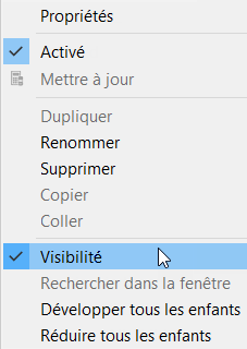 Le paramètre de visibilité d'un noeud parent remplace les paramètres de visibilité de ses éléments enfants. Par conséquent, si vous désactivez l'option Visibilité pour un noeud parent, tous ses enfants seront masqués, quels que soient leurs paramètres de visibilité. Si vous activez la visibilité d'un noeud parent, seuls ses enfants dont la visibilité est activée sont affichés.