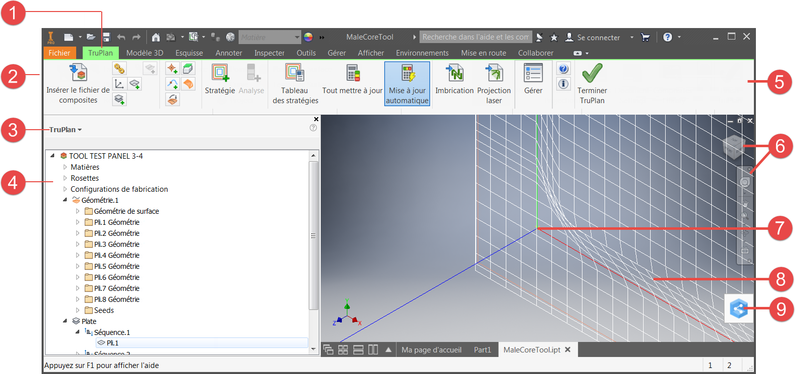 - Ruban de TruPlan. Consultez l'aide pour obtenir des informations sur l'ouverture et l'insertion de composites, la création d'objets tels que des couches et des plis, l'ajout et la projection de points et de courbes, le maillage par approximation de surfaces, ainsi que la création de sorties d'imbrication et de projection laser.