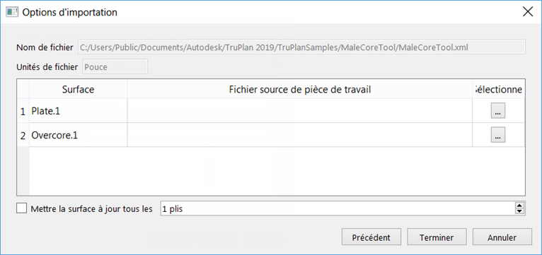 permet d'importer des données de composites depuis un système de CAO tiers dans votre application hôte (c'est-à-dire, Autodesk Inventor). Commencez par ouvrir un fichier XML contenant la structure de votre projet, puis ajoutez les fichiers STL contenant les surfaces de pièce de travail correspondantes. Autodesk recommande de faire correspondre les noms des fichiers STL aux noms des surfaces dans le fichier XML. Si vous apportez des modifications aux fichiers STL référencés à l'aide d'un logiciel de CAO, les modifications seront reflétées dans TruPlan.