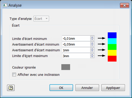Une analyse est une évaluation des grilles de maillage de surface et de trajectoire des fibres d'une stratégie à la recherche d'irrégularités ou de déformations. Cela vous permet ainsi d'ajuster votre stratégie de manière à optimiser la fabrication de votre pièce. Une analyse fournit uniquement des informations sur votre conception et votre stratégie, et met en surbrillance les zones pouvant provoquer des problèmes lors de la fabrication. Si vous avez besoin de corriger des problèmes, vous devrez probablement le faire directement dans votre stratégie, voire dans votre conception initiale.