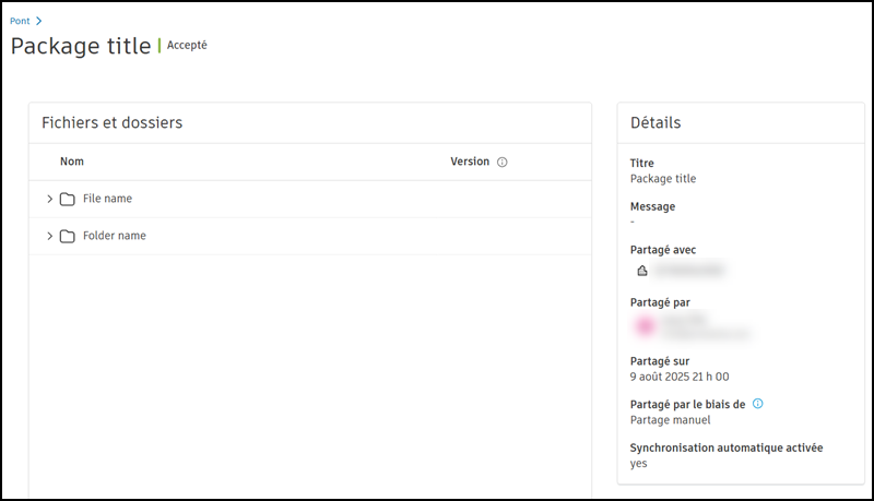 Titre : le nom du groupe d'éléments du plan définitif, des feuilles, des fichiers ou des dossiers qui ont été partagés avec votre projet. Cette valeur peut provenir des éléments suivants :