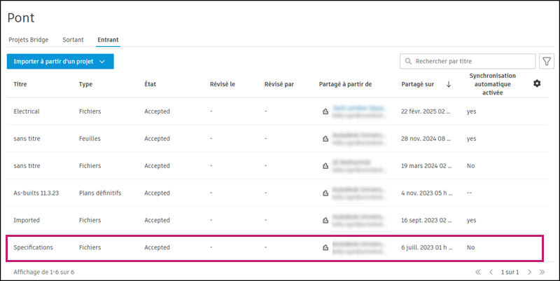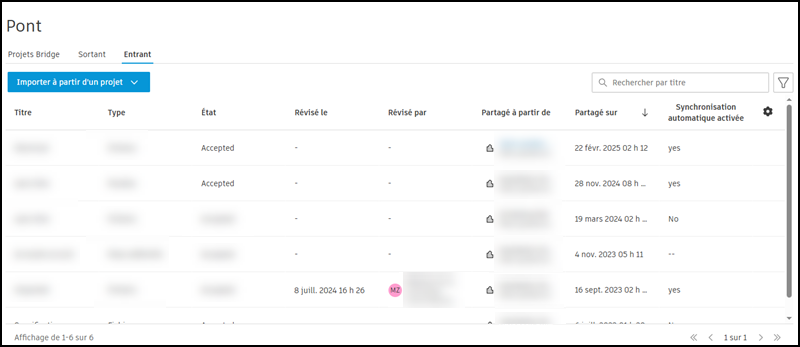 Dans l'onglet Entrant de l'outil Pont, vous pouvez voir une liste contenant des informations sur les données partagées avec d'autres projets.