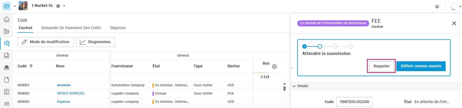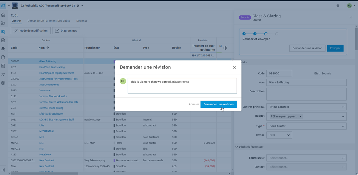 Vous pouvez maintenant envoyer un contrat pour révision par le fournisseur :