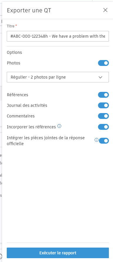 L'exportation de QT permet de créer des rapports complets qui jouent le rôle de documentation essentielle pour un projet. Ces rapports peuvent être personnalisés de manière à inclure des QT individuelles dans un format PDF ou à englober toutes les QT au format PDF ou XLSX.