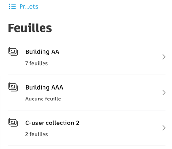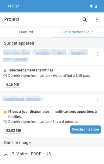 Vous pouvez également mettre à jour les feuilles à partir de la liste des projets. Si des mises à jour sont disponibles, un message Mises à jour disponibles : modifications apportées aux feuilles s’affiche sous le projet concerné dans la liste des projets. Appuyez sur Synchroniser pour effectuer la mise à jour.