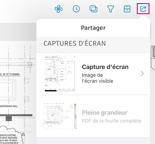 Vous pouvez sélectionner un instantané de l’écran visible ou un PDF de la taille réelle de la feuille.
