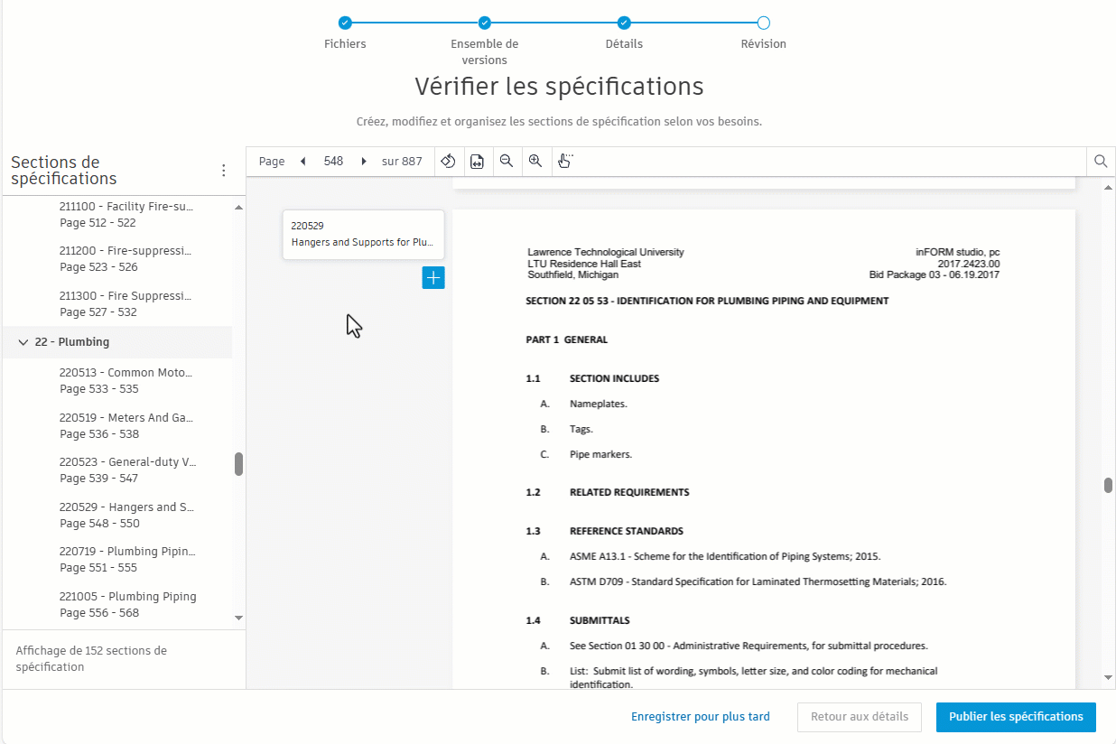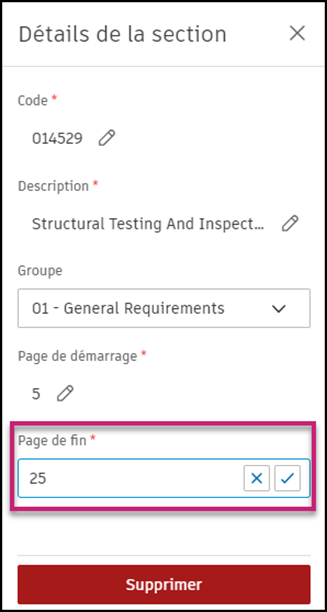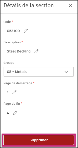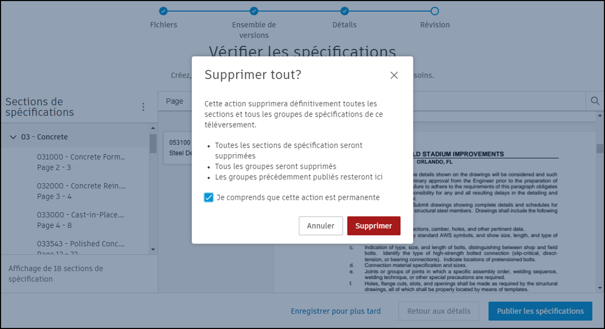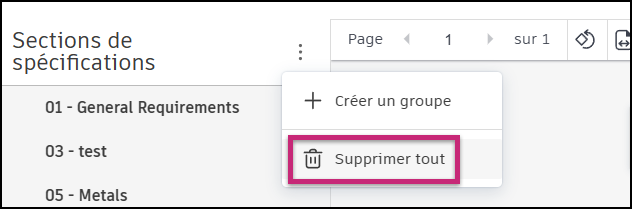 .Reportez-vous à la rubrique Suppression de toutes les sections de spécification pour apprendre comment supprimer définitivement toutes les sections provenant d’un téléversement.