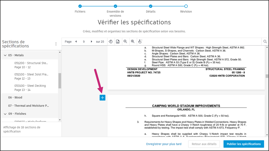 Lorsque vous faites défiler la spécification, vous pouvez utiliser le bouton Plus bleu affiché au début de chaque page pour ajouter des sections.
