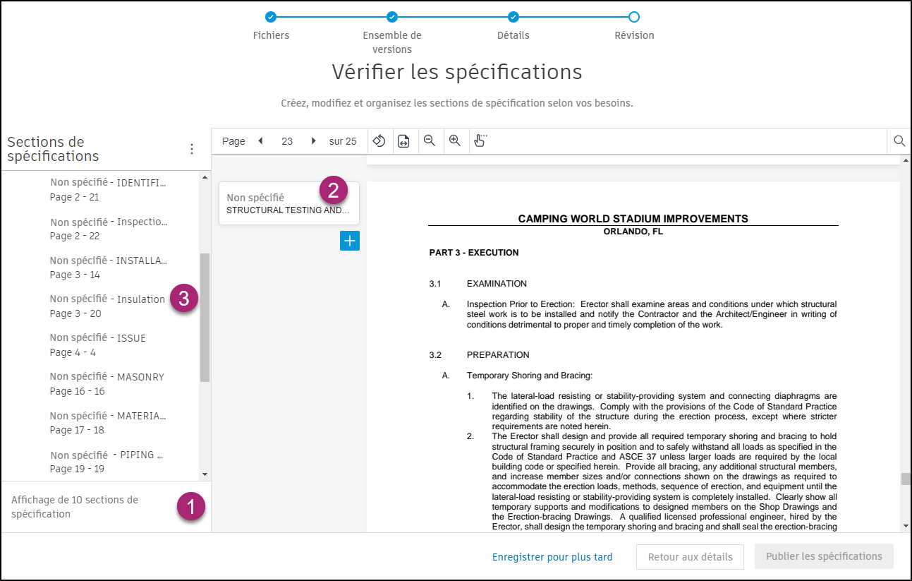 2 : les marqueurs de section indiquent les pages de départ des sections générées automatiquement et fournissent des informations sur les codes et les descriptions des sections. Pour plus d’informations, reportez-vous à la rubrique Modifier des sections de spécification.