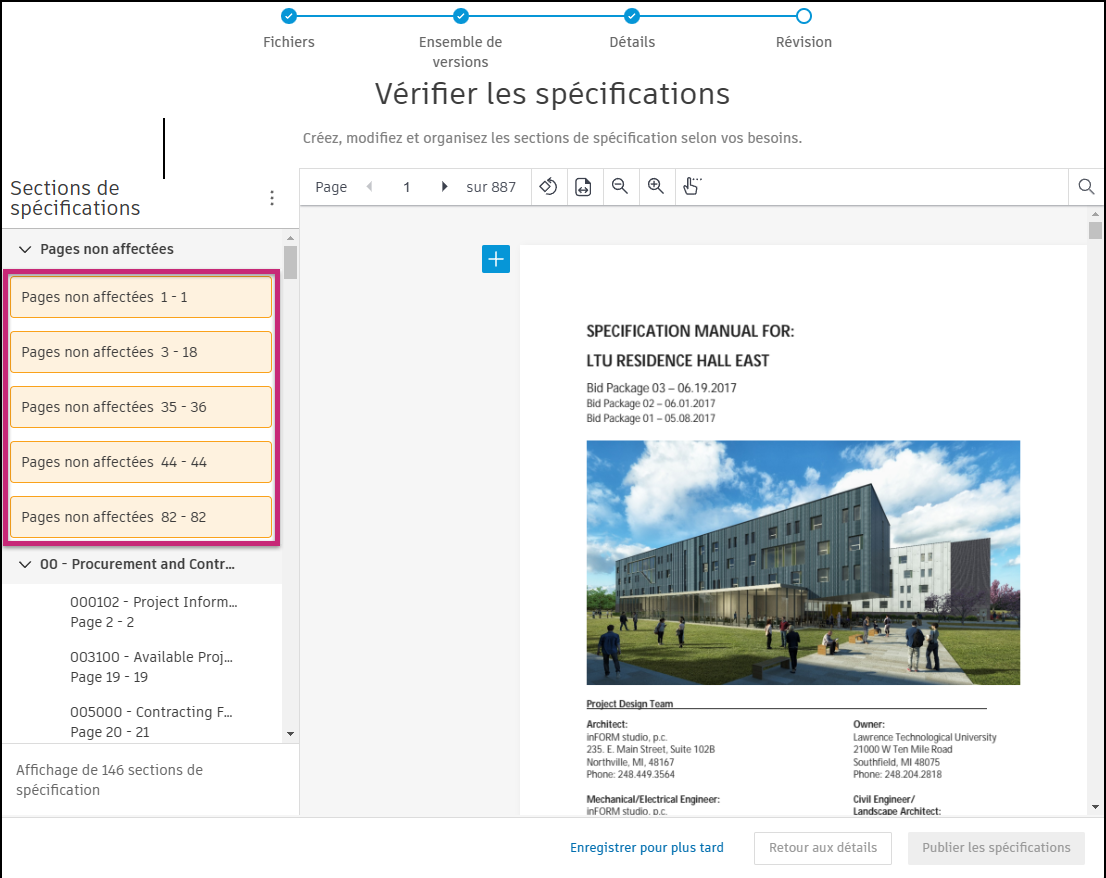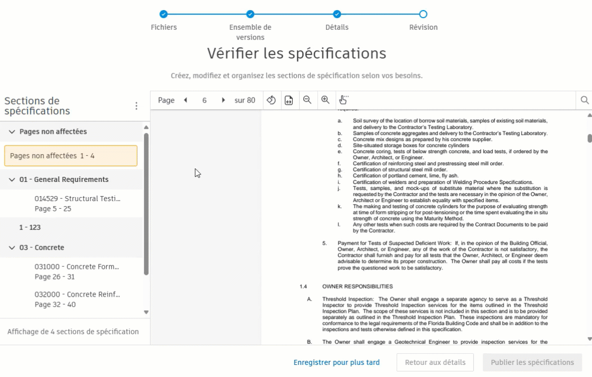 Découvrez comment gérer les pages de spécification non affectées et ajouter des sections de spécification.