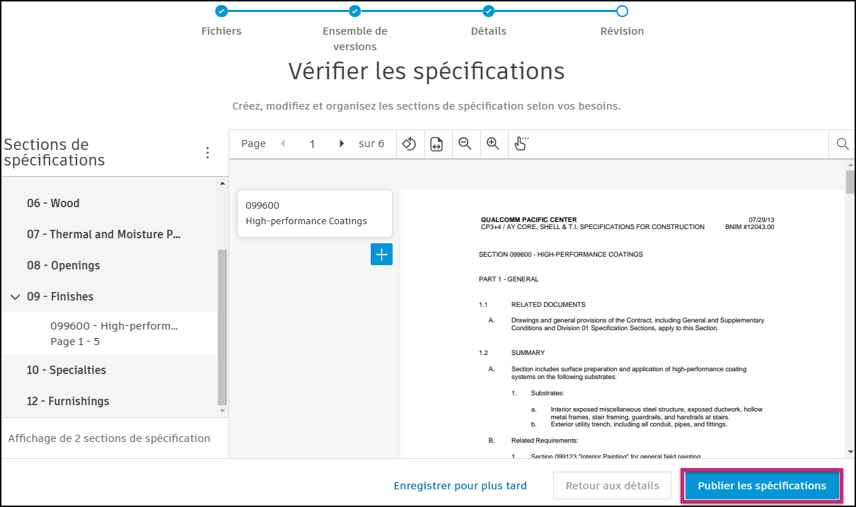 Lorsque vous avez entré correctement toutes les informations de la section, cliquez sur Publier les spécifications.