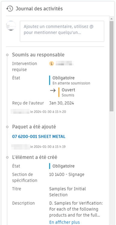 Affiche un historique de toutes les activités liées à l'élément de soumission.