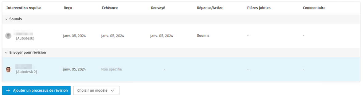 Lorsqu'un élément n'est pas à l'état de révision, la colonne « Action en attente de » affiche la même valeur que la colonne « Intervention requise ».