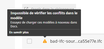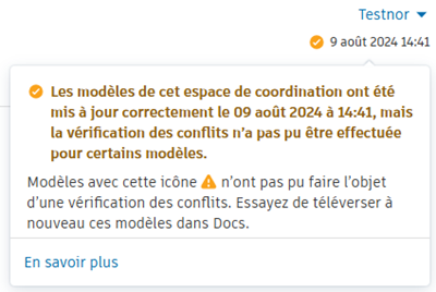 apparaît sur le sélecteur d’espace de coordination, cela signifie que la vérification des conflits a bien été globalement traitée, mais que certains modèles n’ont pas pu être vérifiés.