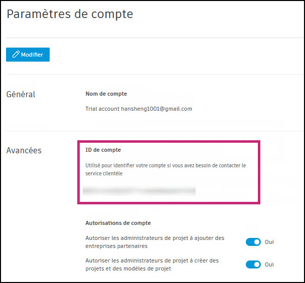 Pour tout ce qui concerne la prise en charge, ou pour connecter des intégrations personnalisées (uniquement pour les comptes d'entreprise), vous avez besoin de l'identifiant unique de compte Autodesk Construction Cloud. Pour l'afficher :