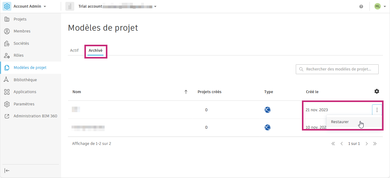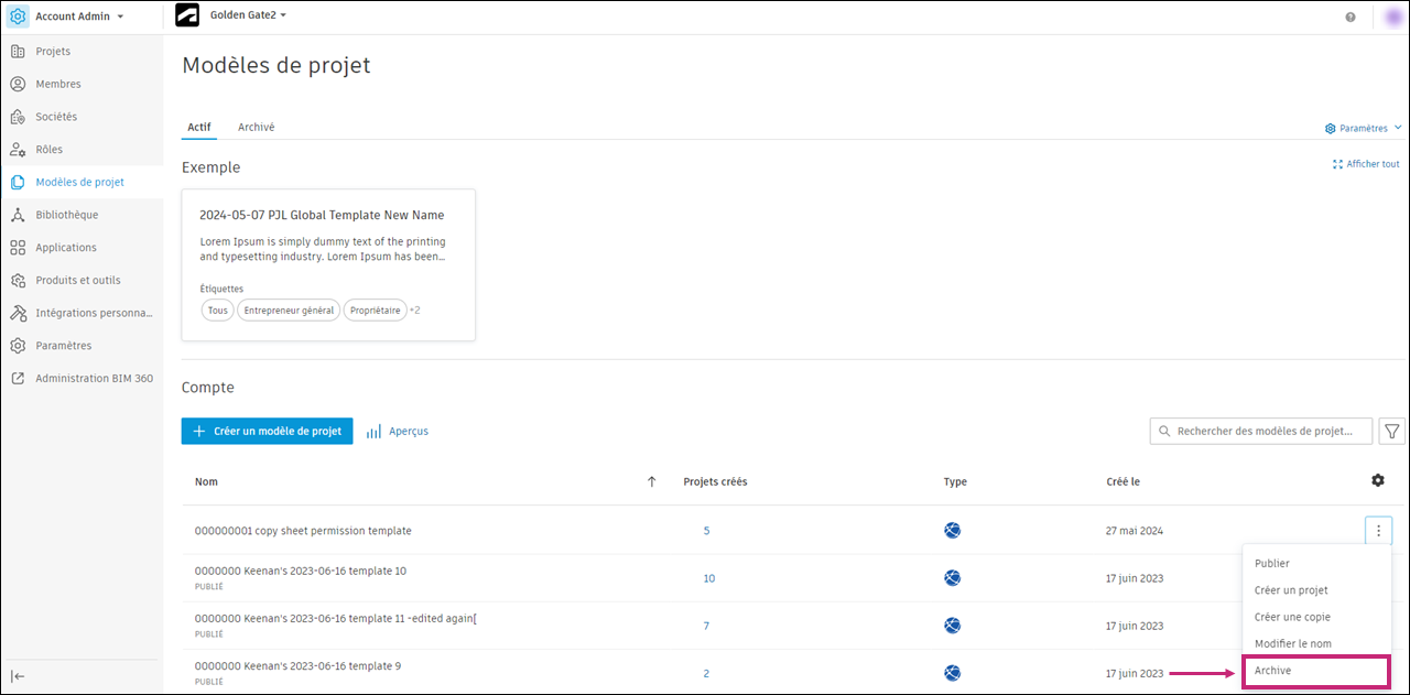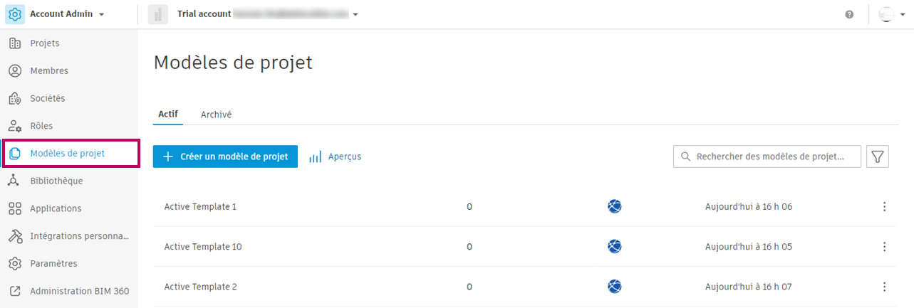 Vous pouvez rechercher des modèles de projet actifs et archivés dans l'outil Modèles de projet de Account Admin.
