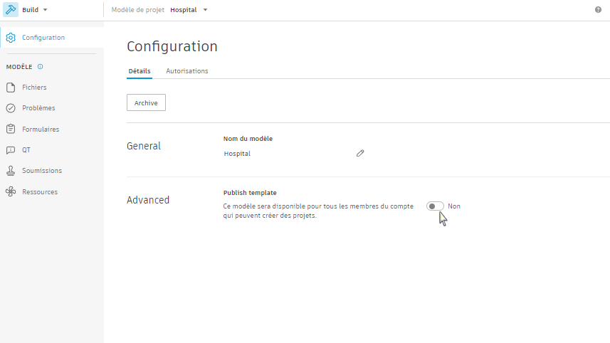 Dans le menu Configuration, dans le tableau de bord Détails avancés, activez le modèle Publier.