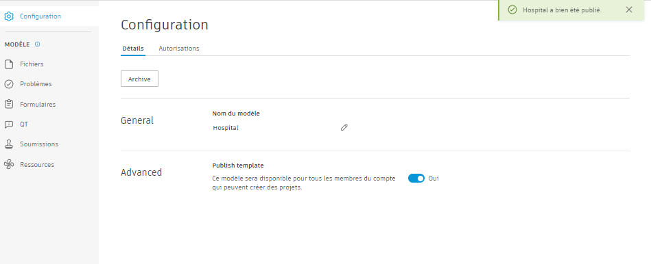 Vous verrez alors un message vous informant que votre modèle de projet a été publié avec succès.