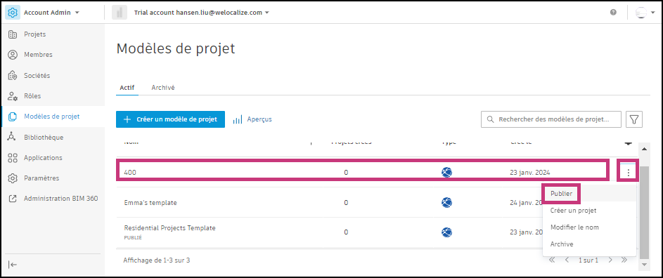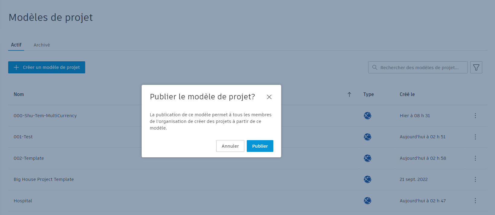 Pour publier un modèle de projet, sélectionnez le modèle de projet que vous souhaitez publier.