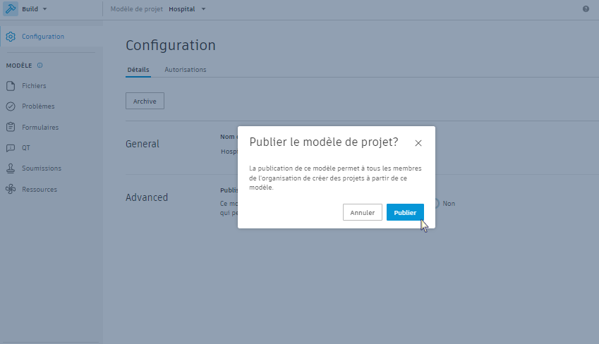 Lorsque la zone Publier le modèle de projet? s’affiche, cliquez sur le bouton Publier.
