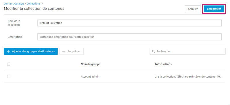 Les administrateurs de compte peuvent créer, modifier et supprimer des collections pour le catalogue de contenu dans la bibliothèque.