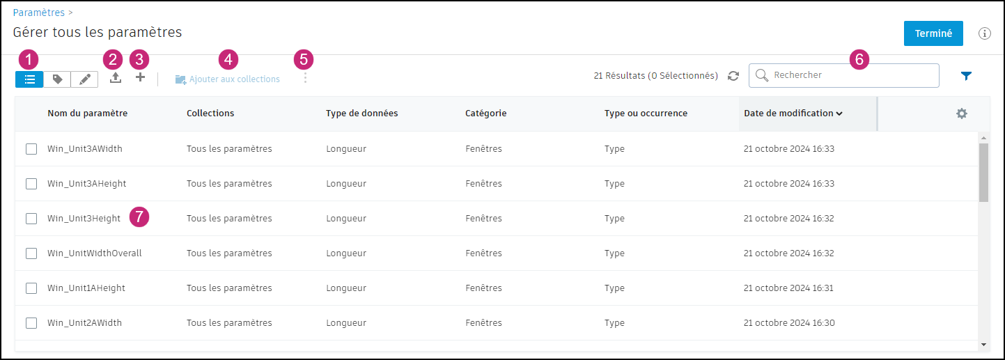 Ajouter aux collections : cochez les cases en regard des paramètres dans la liste et cliquez sur Ajouter aux collections. Sélectionnez les collections auxquelles vous souhaitez ajouter ces paramètres, puis cliquez sur Ajouter.