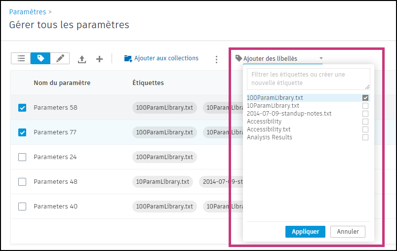 Tapez dans la zone de texte pour rechercher des étiquettes ou pour en créer de nouvelles. Pour valider la création d’une nouvelle étiquette, cochez la case à côté de l’étiquette; celle-ci sera appliquée au paramètre sélectionné et sera maintenant accessible pour être appliquée à d’autres paramètres.