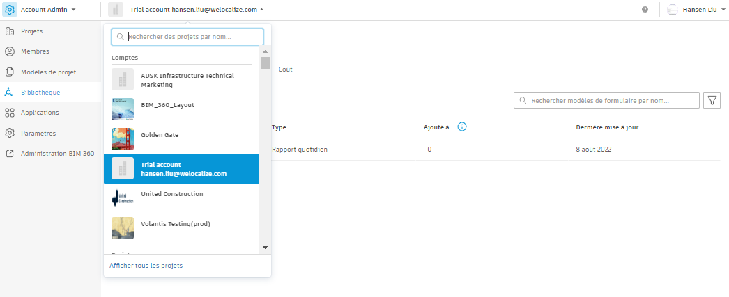 Les paramètres du service sont organisés sous un compte Autodesk Construction Cloud. Dans la partie supérieure gauche de la page, vous verrez un menu déroulant avec tous les comptes auxquels vous avez accès.