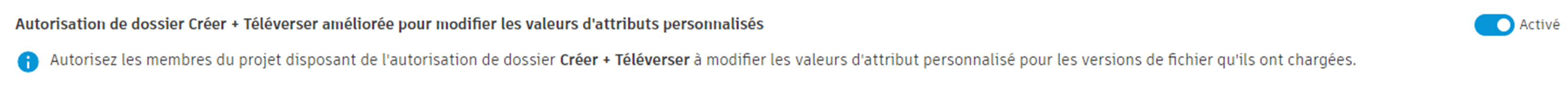 Activez ce paramètre pour permettre aux membres du projet disposant de l'autorisation de dossier Créer + charger de modifier les valeurs d'attribut personnalisé pour les versions de fichier qu'ils ont chargées.