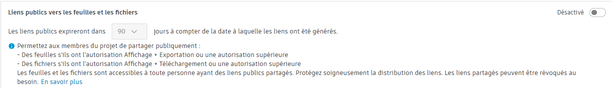 Le paramètre Liens publics vers les feuilles et les fichiers vous permet d’activer ou de désactiver le partage de liens vers un fichier pour les membres ne faisant pas partie du projet. Lorsque cette option est activée, seuls les membres du projet disposant au moins des autorisations Afficher + Télécharger peuvent générer un lien vers un fichier ou un dossier pouvant être partagé publiquement.