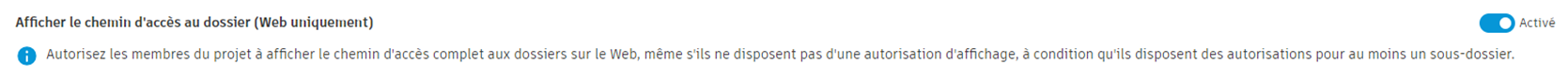 Activez le paramètre Afficher le chemin du dossier (Web uniquement) pour permettre aux membres de voir le chemin d’accès complet au dossier, y compris les dossiers qu’ils n’ont pas le droit de consulter, à condition qu’ils aient l’autorisation d’accéder à au moins un sous-dossier.
