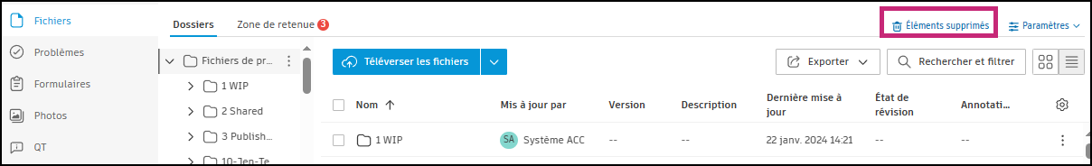 Les membres disposant d'une autorisation Modifier ou supérieure peuvent accéder aux articles supprimés pour restaurer des fichiers et des dossiers. Vous pouvez également rechercher et filtrer les fichiers ou les dossiers du projet si vous ne les trouvez pas et si vous devez vérifier qu'ils ont été supprimés.