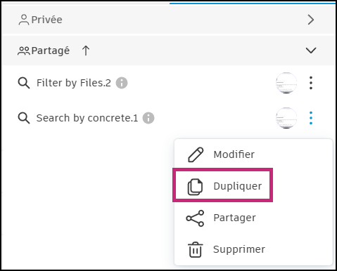Vous pouvez dupliquer une recherche enregistrée que vous avez partagée ou une recherche partagée avec vous par un autre administrateur de projet.