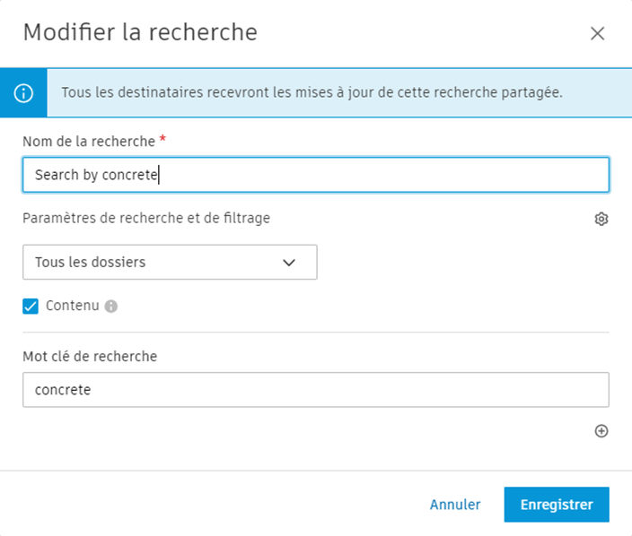 Lorsque vous modifiez une recherche partagée, tous les destinataires reçoivent automatiquement les mises à jour.