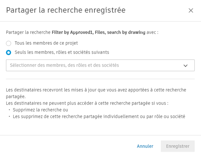 Sélectionnez cette option pour partager la recherche enregistrée avec tous les membres du projet ou avec les membres, les rôles ou les sociétés sélectionnés.