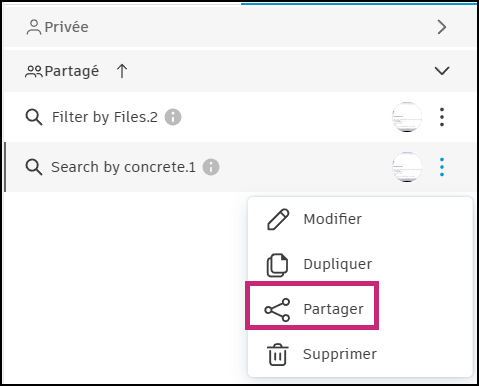 Cliquez sur le menu Plus en regard de la recherche enregistrée partagée pertinente.