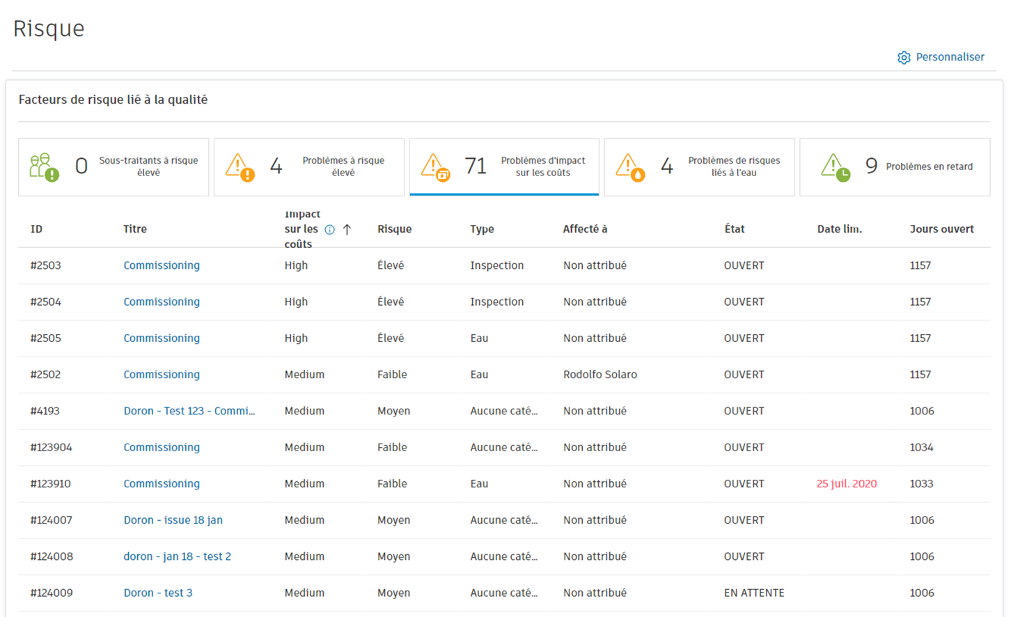 Le coût est un aspect important d'un projet. Le facteur Problèmes d’impact sur les coûts permet aux chefs de projet d’évaluer les problèmes de qualité en suspens ayant le plus fort impact sur les coûts. Ils peuvent alors définir des priorités pour éviter de dépasser le budget et de nuire aux résultats du projet.