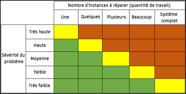 Les problèmes sont alors classés comme élevés, moyens ou faibles en fonction de la gravité des problèmes et de la somme de travail requise :