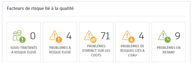 La carte récapitule les problèmes liés aux risques élevés du projet, les catégories de risques précises, telles que les problèmes d’eau et les sous-traitants présentant un risque élevé. Elle indique également les problèmes dont le traitement est en retard et les données sur les activités de la liste de contrôle.