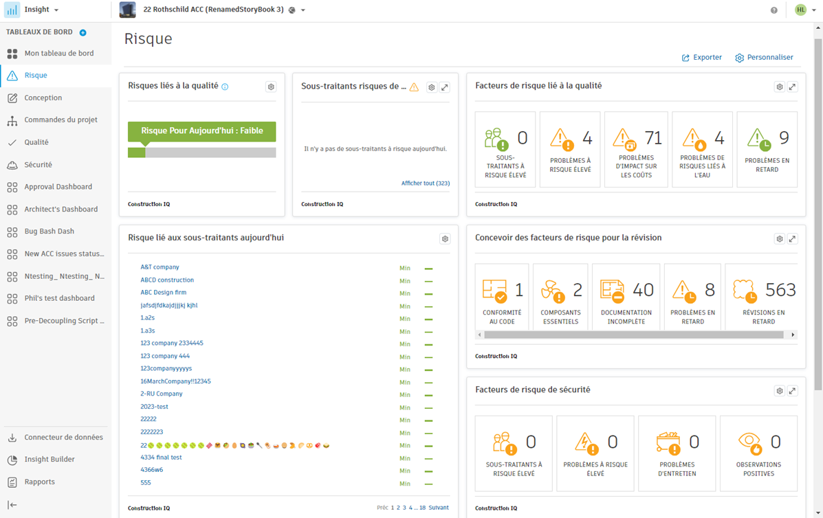 Étudiez les risques de qualité et de sécurité quotidiens à partir des données de projet et des analyses de Construction IQ, qui attribuent automatiquement un niveau de risque aux problèmes, classent les risques et les calculent en fonction des facteurs de risque de qualité affichés.