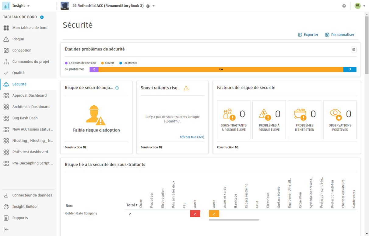La sécurité est une préoccupation majeure dans le secteur de la construction. Les fonctionnalités d'apprentissage machine de Construction IQ peuvent être utilisées avec des intégrations partenaires comme Smartvid.io pour déceler les risques liés à la sécurité. Ces données peuvent être triées et visualisées par emplacement. Les chefs de projet peuvent ainsi mieux comprendre les pratiques de sécurité des sous-traitants, cibler les risques récurrents et prioriser les projets ou les unités commerciales qui nécessitent une attention particulière. L'analyse des données de sécurité est également utile pour créer une culture de sécurité positive en mettant en évidence les meilleures pratiques et des procédures de travail sûres.