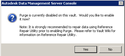 在安装 Service Pack 2 for Vault 2012 版本和 Service Pack 1 for Vault 2013 版本后,将针对所有移植的 Vault 自动禁用“清除”功能。该功能处于禁用状态,以便于您修复现有数据(可能有悬挂文件关系),然后再使用“清除”。