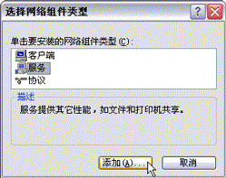 - 在“选择网络组件类型”中,选择“服务”然后单击“添加”。