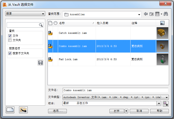 Autodesk Vault Workgroup、Collaboration 和 Professional 用户。从“版本”列表中选择所需的文件版本。