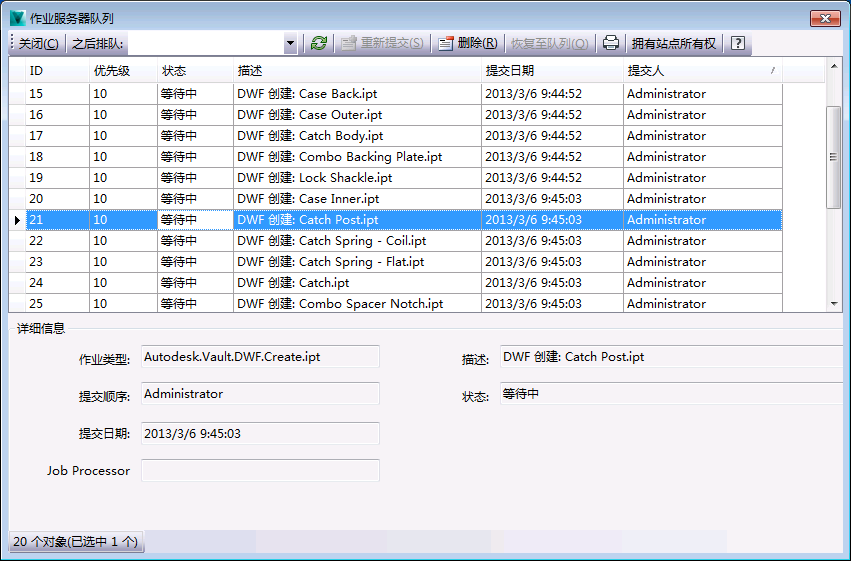 作业服务器队列是等待处理的客户端(Inventor、AutoCAD、Vault、Autoloader)所提交作业的列表或队列。此队列是通过 Vault 服务器存储和管理的。